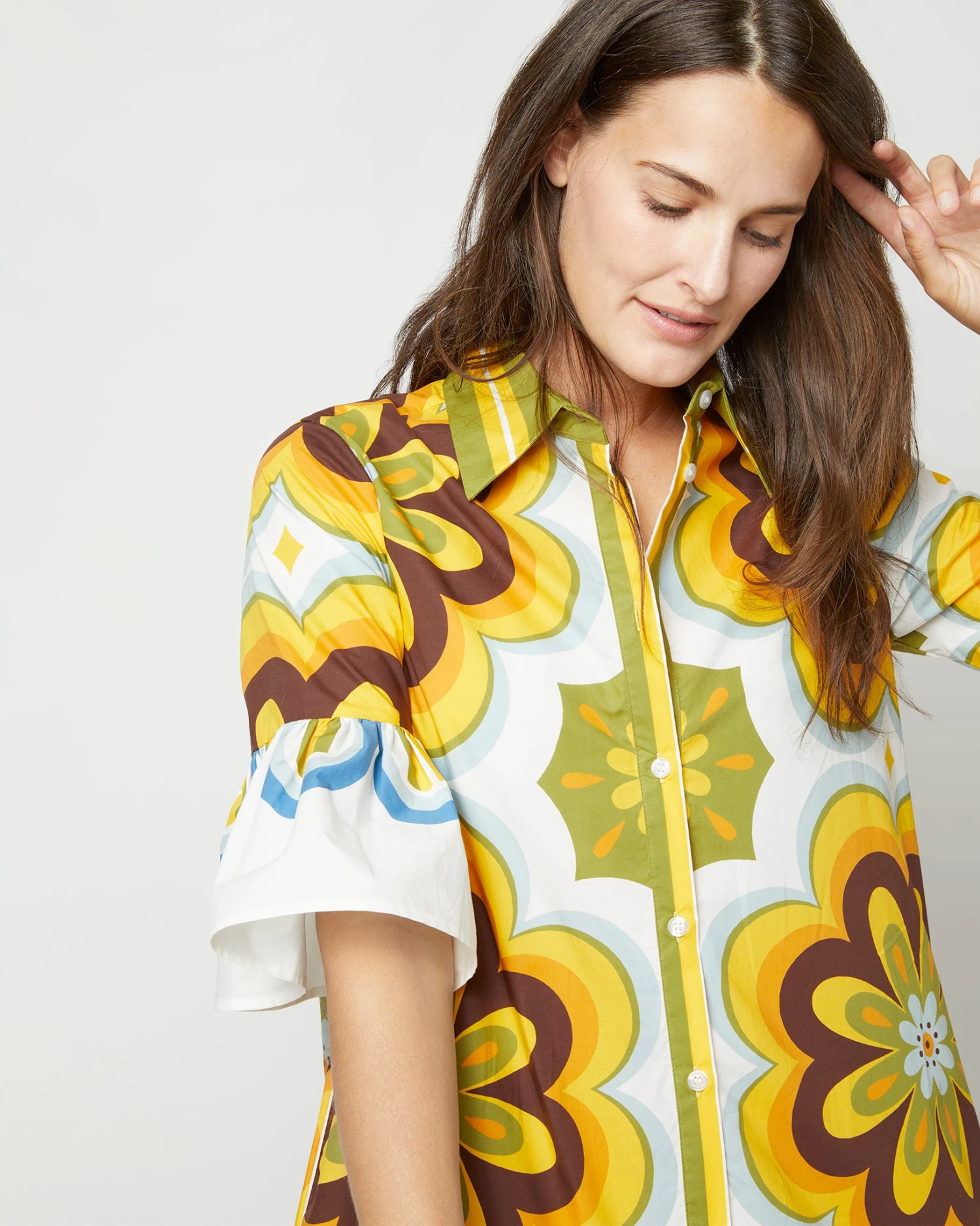 Milan-based La DoubleJ makes party-ready skirts and dresses in reissued vintage fabrics, “distilled through a lens of pure joy, eye-popping print and love of all things maximal.” Sounds about right! The Choux Dress has fluted three-quarter sleeves, a pointed collar, and a tiered skirt. This one is made from Italian cotton poplin with a placed, geometric print.