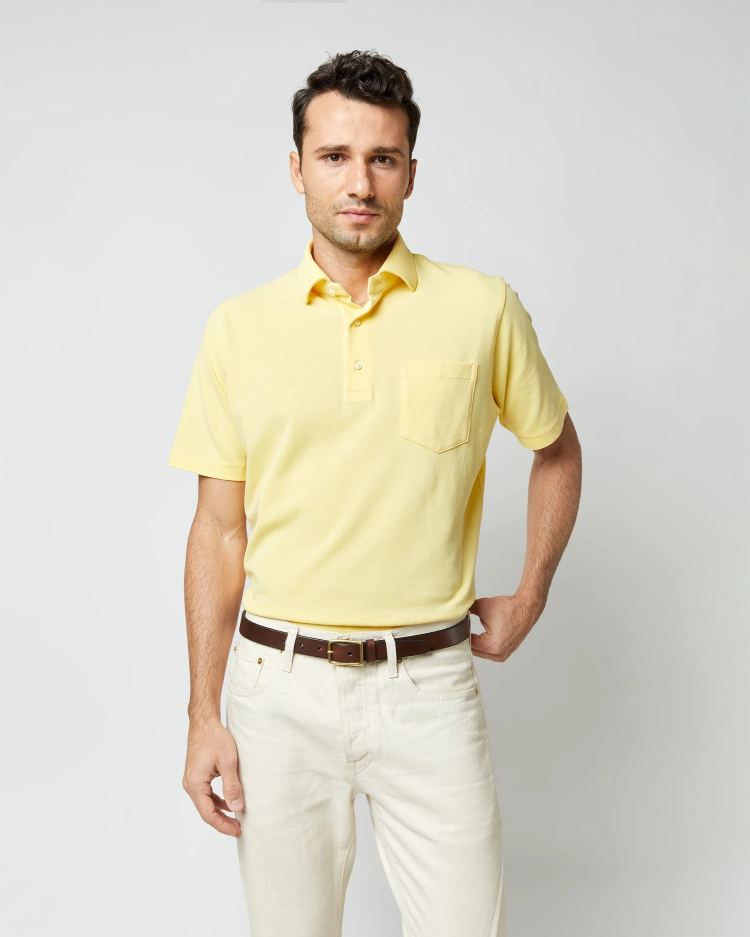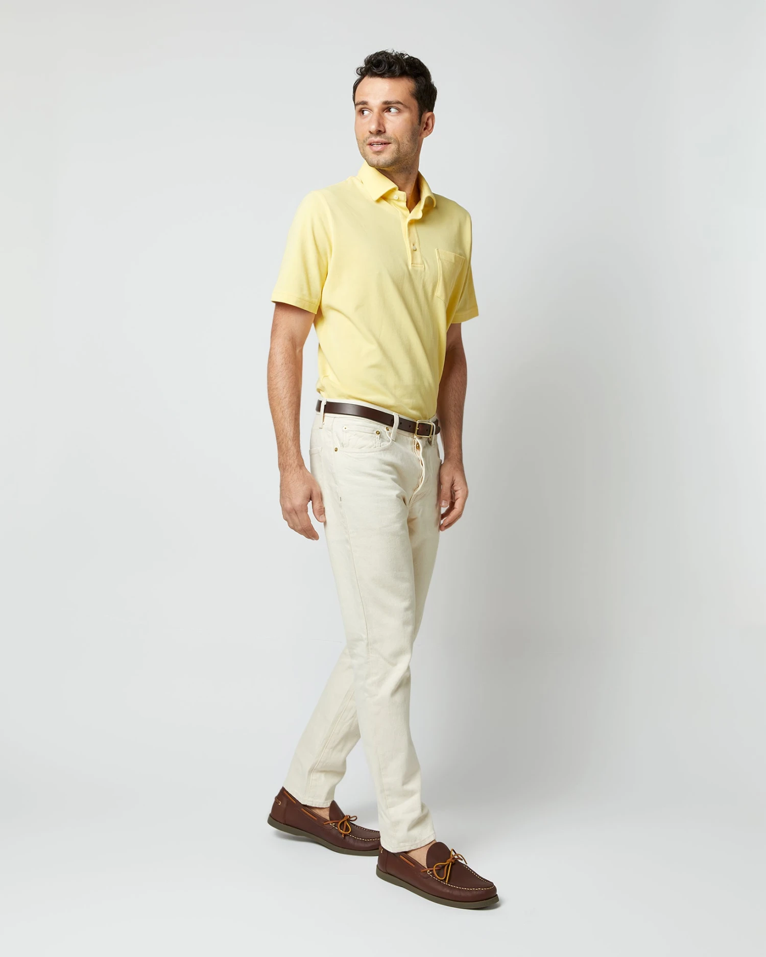 A polo’s one of those things that almost everyone’s got in his closet, but we think ours is kind of special. It’s got a cut-and-sew collar supported by a collar band (just like a sport shirt, which means it can stand up under a jacket,) a tennis tail that can go tucked-in or not, and no branding except for a tiny SM at the lower left hem embroidered in green. This one’s made from pima pique that’s airy and rugged at the same time. Pima’s like the cashmere of cotton. It only gets softer — without pilling, without clinging — the more you wear it.