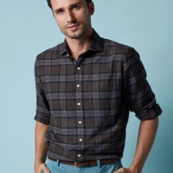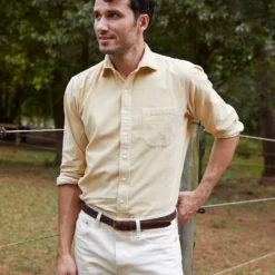 An awning stripe is quintessential Jermyn Street, with wide, even lines of blue and white. It’s bold, but surprisingly easy to wear, and it makes for a super-old-school-menswear dress shirt. This one’s got a modified spread collar with lightweight, fused interlining to lend some structure. (A little inside baseball: the collar point length is designed to sit in perfect harmony with the widths of our ties and our jacket lapels, all 8cm exactly.) As always, the cut is slim but never skinny, with a high armhole for mobility and a long-enough-to-stay-tucked-in shirttail. It’s made with single-needle stitching, 22 stitches/inch, flat-felled seams, and thick, 3.5mm Trocas shell buttons. And while they’re designed to look fantastic with a tie, all of our dress shirts can be opened up and worn more casually — in fact, on weekends, we wear them as sport shirts.