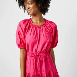 In-store favorite Ulla Johnson makes feminine, bohemian pieces that are heavy on handcraft and special details. The Marion Dress is a stepped-up LBD made of satin-back crepe with short sleeves, a flattering waist tie, a ruffled peplum, and a midi-length skirt with a slit detail.